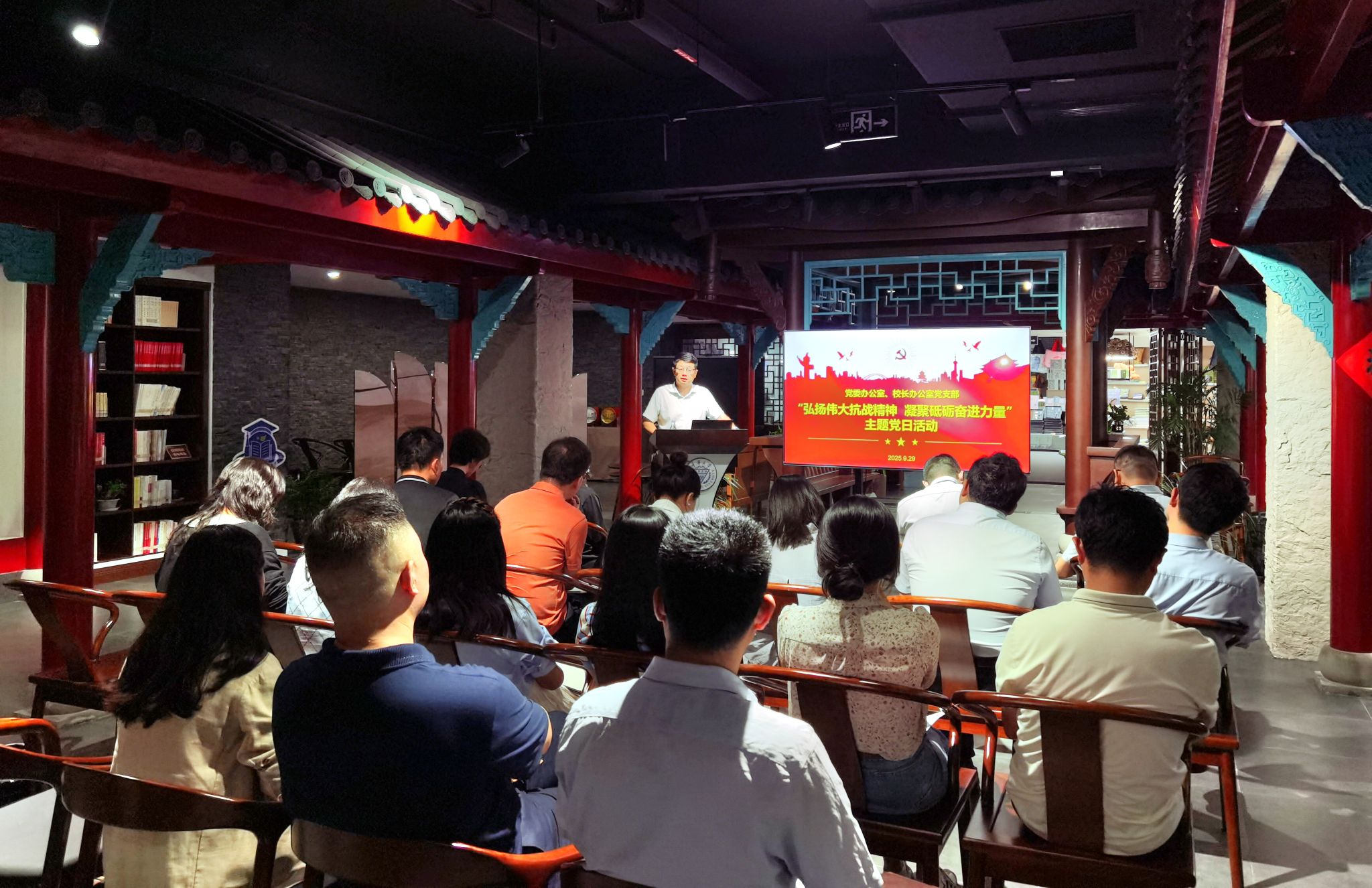 2025年9月29日,党办校办党支部开展“弘扬伟大抗战精神 凝聚砥砺奋进力量”主题党日活动,认真传达学习习近平总书记在纪念中国人民抗日战争暨世界反法西斯战争胜利80周年大会上的重要讲话精神,开展“深耕‘四课堂’,奋勇争先锋”支部品牌建设之“增智课堂”——“智库引活水 专家讲堂”主题活动。产业党委书记关慧参加,党办校办党支部全体同志参加学习。会议由党支部书记陈林主持。